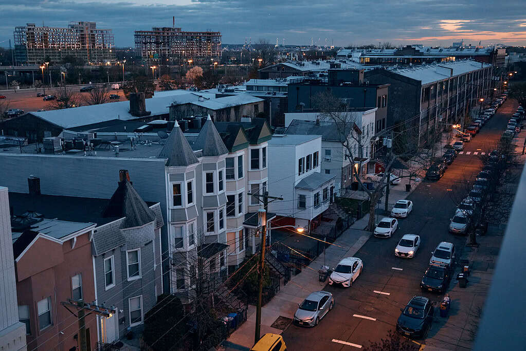 The urban landscape is lit at sunset in Jersey City, New Jersey. Photo: Andres Kudacki for The Jersey Vindicator.