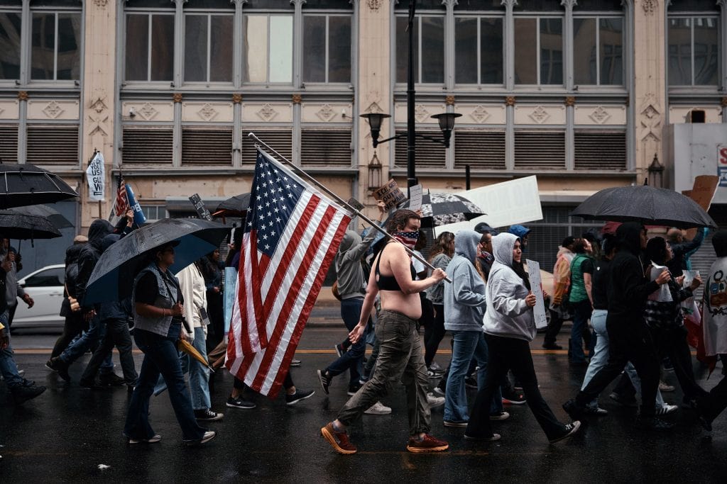 Protestors march during the No Kings Day Rally on Saturday, June 14, in Newark. Photo by Andres Kudacki for The Jersey Vindicator.