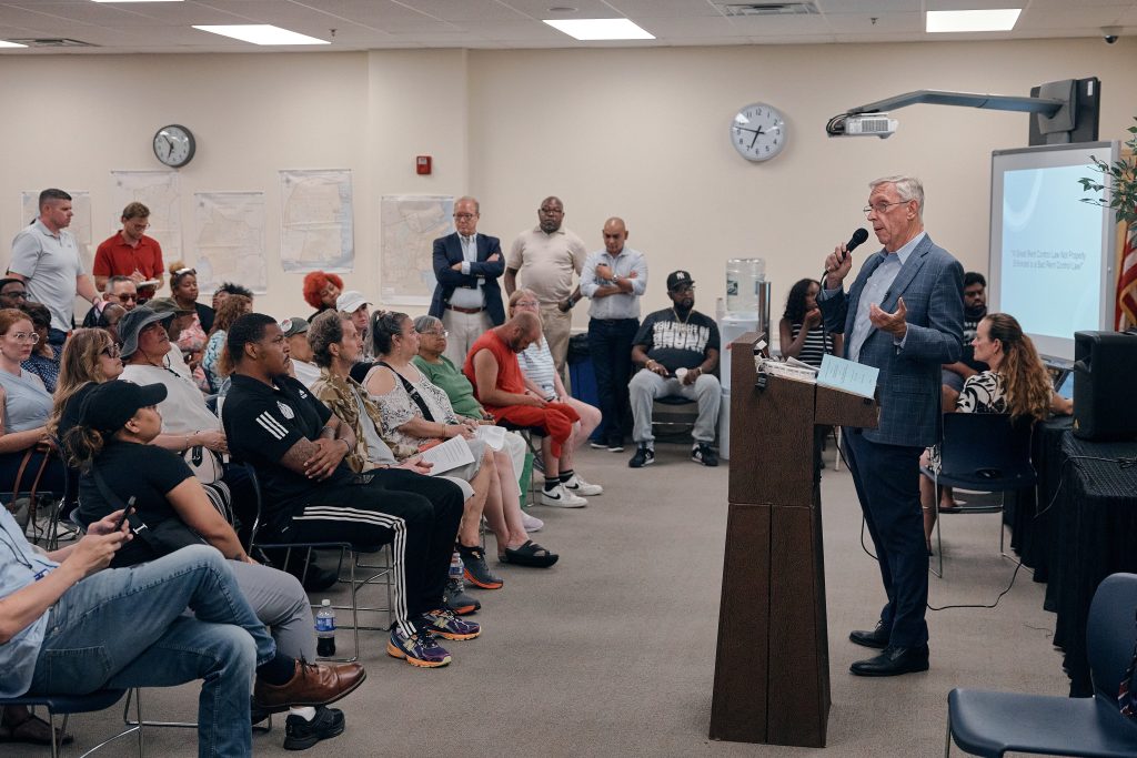 Torres was one of about 120 Jersey City community members who came out on a weeknight to attend a town hall-style meeting to discuss affordable housing, escalating rents, and housing insecurity. The event was hosted by Hudson County Commissioner Bill O’Dea, who is running for mayor of Jersey City where, according to Zillow Rental Manager, the average rent has surged to $2,549 per month — 21% higher than the national average of $2,100.