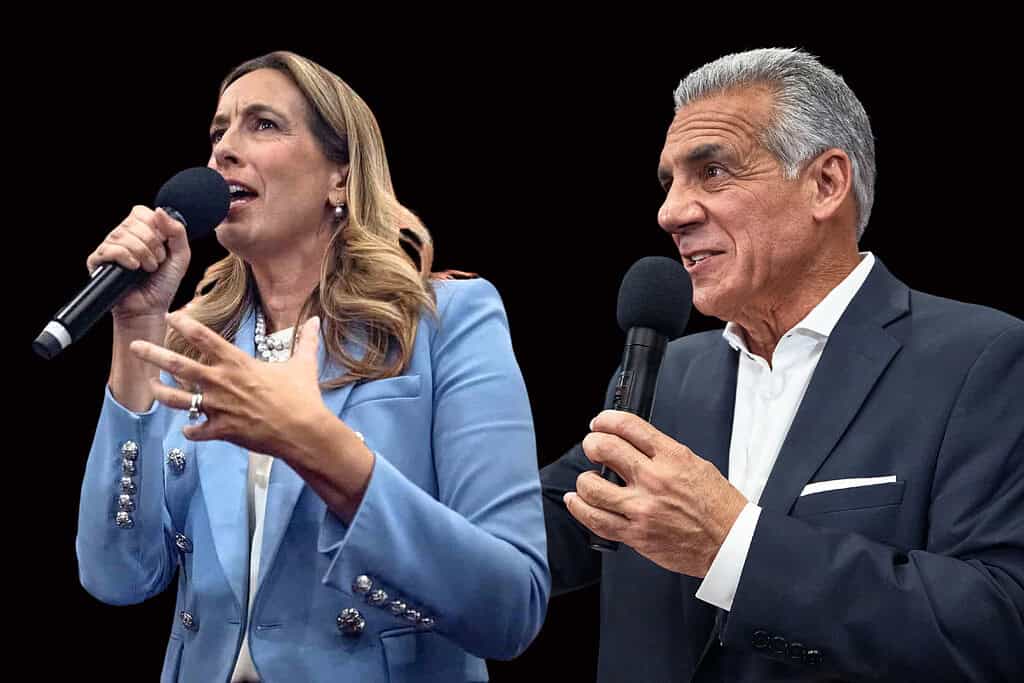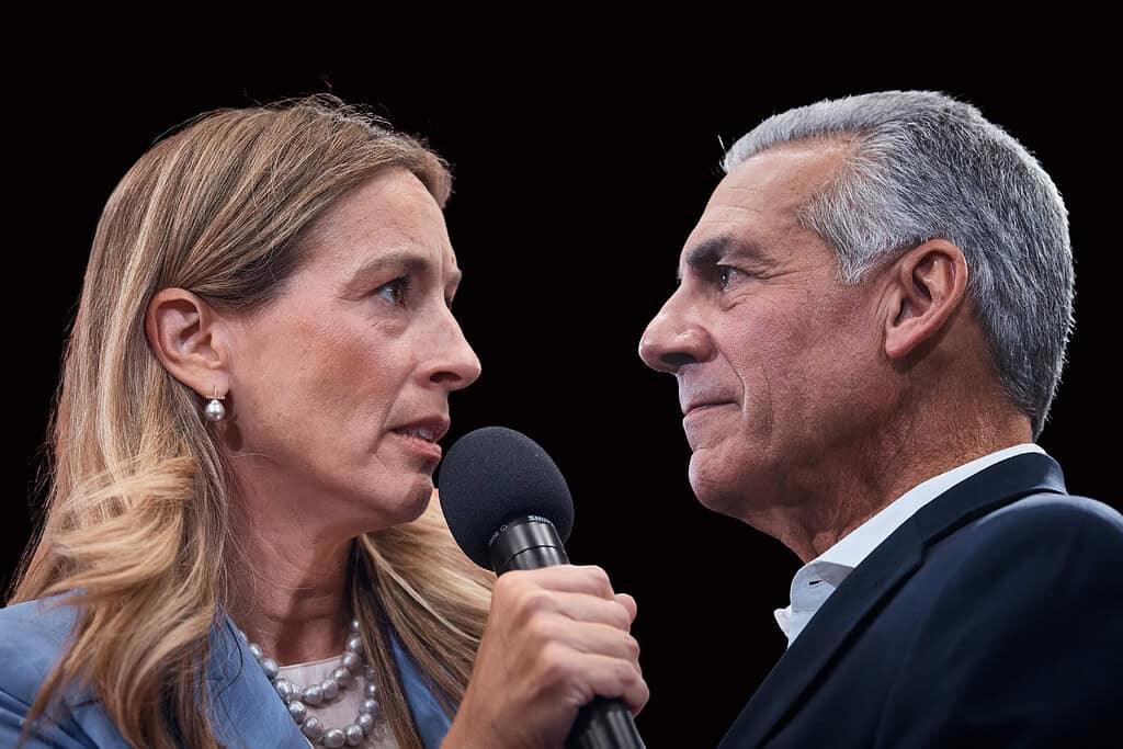 Photo collage. Original photos: Republican Jack Ciattarelli, right, and Democratic candidate Mikie Sherrill, left, at their first debate. Photo by Andres Kudacki for The Jersey Vindicator.