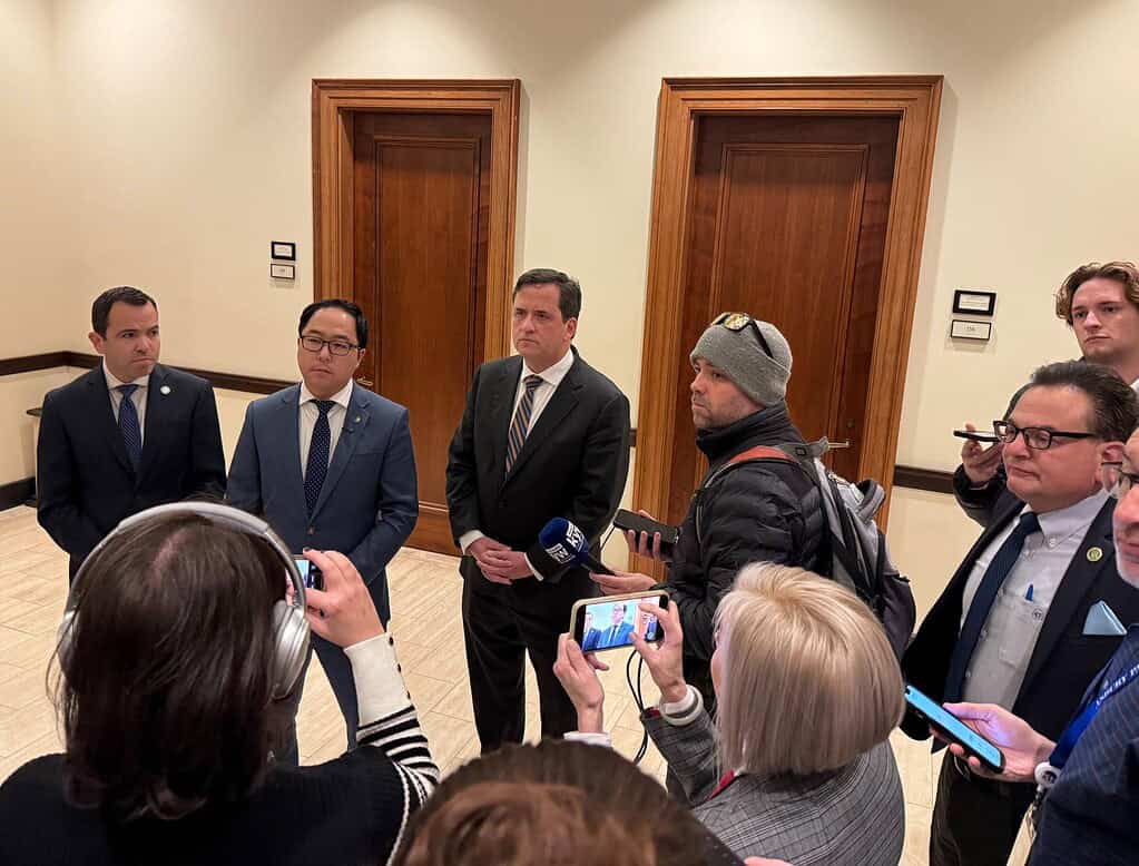 Far left to right, Attorney General Matt Platkin, Senator Andy Kim, and Acting State Comptroller Kevin Walsh speak at a press conference before the Senate committee hearing on Monday.