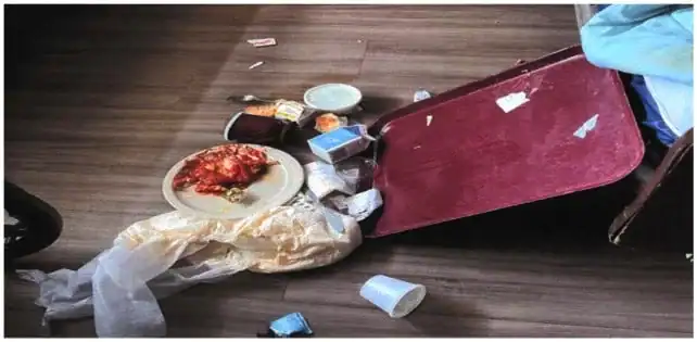 - Rooms contaminated with waste: The volunteer described one resident’s room as smelling strongly of urine and feces. Photos showed a fallen meal tray mixed with dirty diapers, used diapers discarded on the floor, and food left scattered on the ground for long stretches of time.