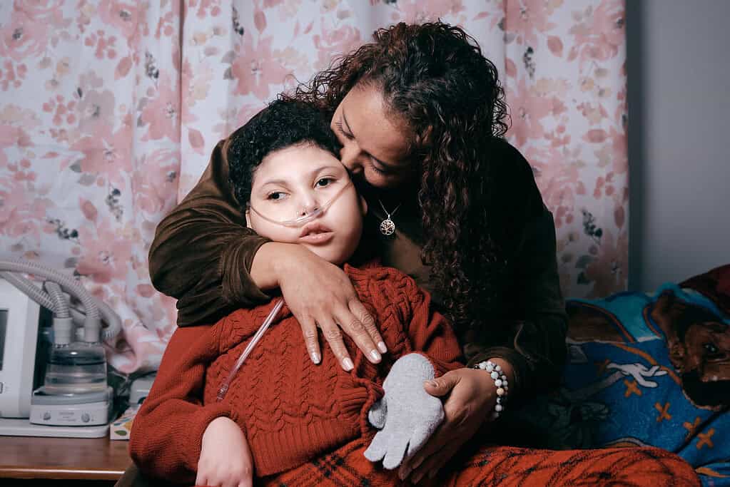 Fanny Núñez holds her son, Néstor, who is connected to an oxygen line, in New Brunswick. Photo by Andres Kudacki for The Jersey Vindicator.