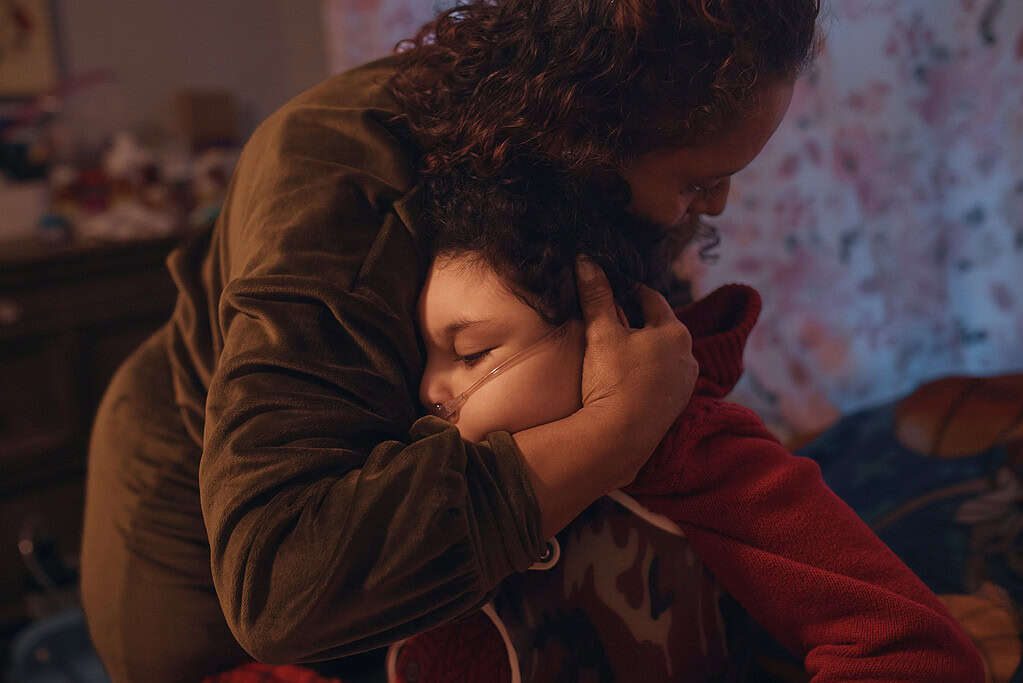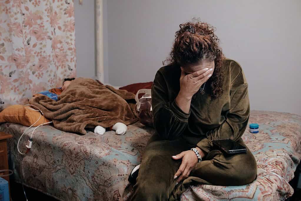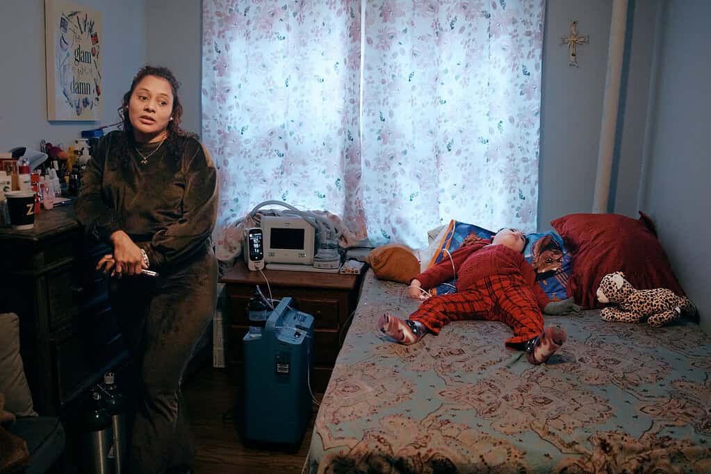 Her days are spent monitoring his oxygen levels and medical equipment, feeding him through a tube, giving him medications, and changing his diapers. She rests only when he sleeps.