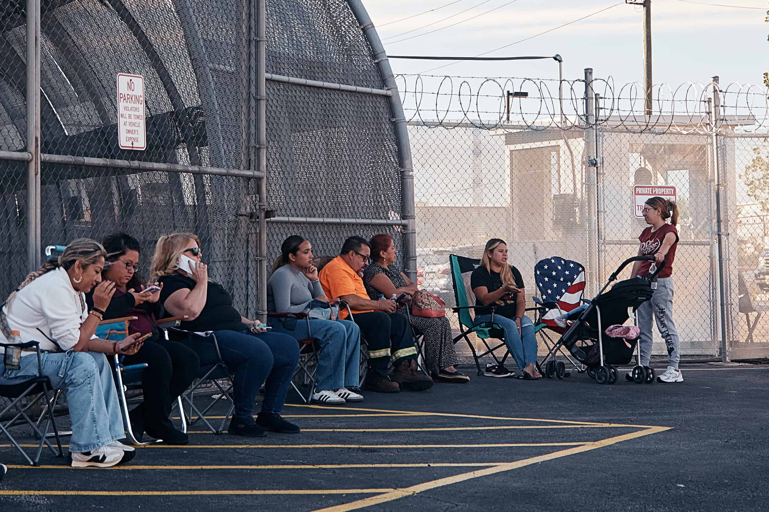 On visiting days, families line up for hours in a small parking lot bordered by chain-link fencwa and barbed wire. There is no indoor waiting area.