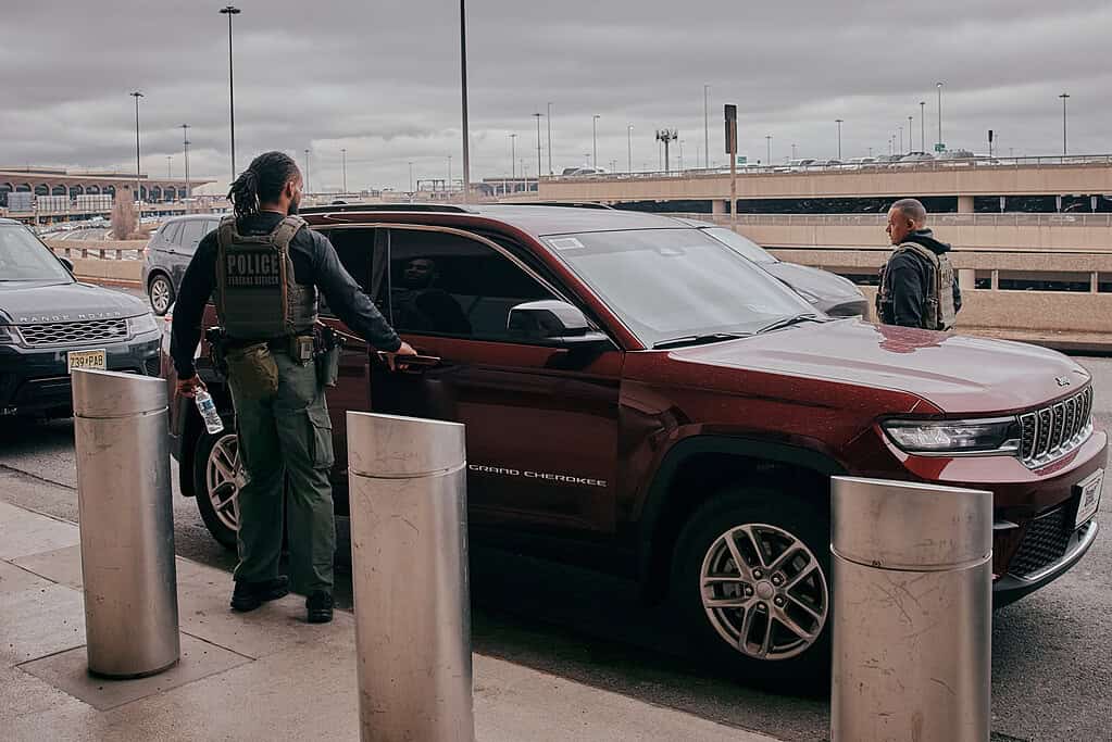 ICE agents on patrol outside Newark Liberty International Airport on March 23. Photo by Andres Kudacki for The Jersey Vindicator.